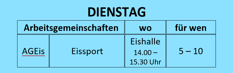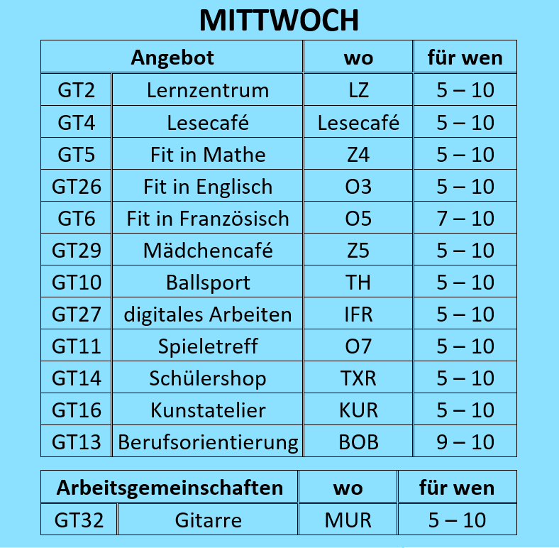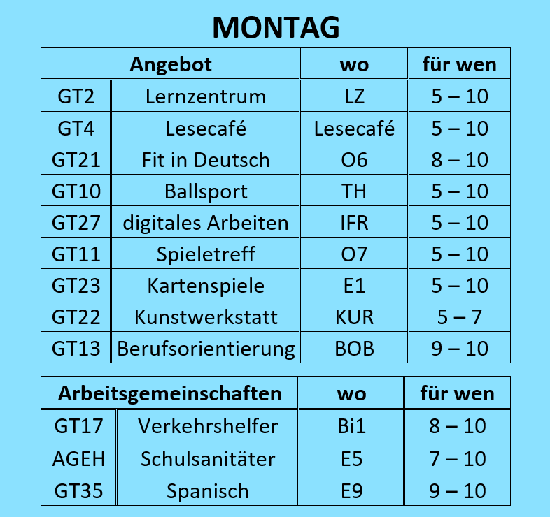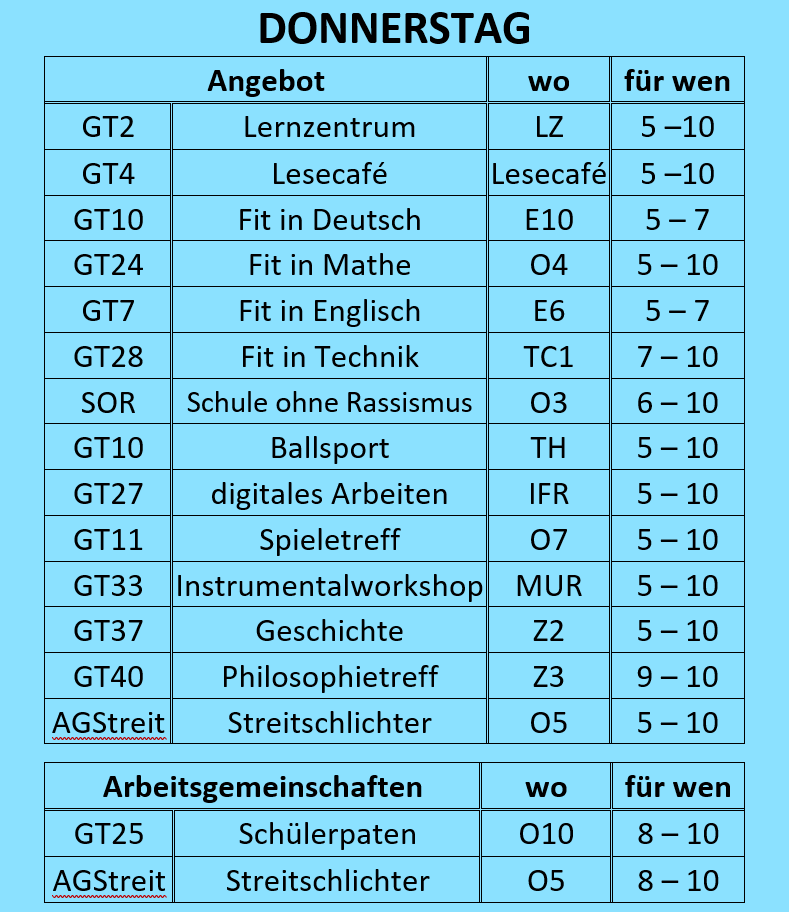 Die Ganztagsangebote finden an den langen Tagen (Mo, Mi, Do) in der Regel in der Mittagspause statt, an den kurzen Tagen (Di, Fr) im Anschluss an den Unterricht. Es handelt sich zumeist um offene Angebote, die auch sporadisch wahrgenommen werden können. Die AGs hingegen sind feste Gruppen, in denen regelmäßige Teilnahme vorausgesetzt wird!